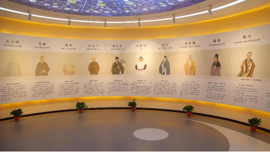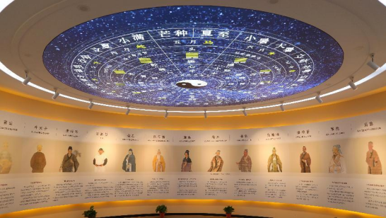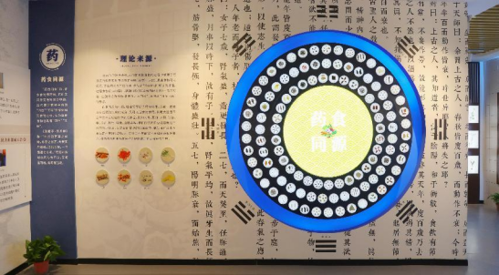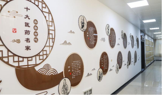 地面和天空均展示了太极图,以黑白两鱼的环抱,演绎了天地万物阴阳之间对立制约、互根互用、相互转化等方面的规律。结合八卦太极图分析一年二十四节气的阴阳消长变化,不仅可以解释二十四节气的命名,更可将医易相结合指导养生。学习传统中医药文化与学院倡导的“七力”和“七者”内容相吻合,对学生进行中医药文化的宣传和教育,使学生热爱中医药文化、传承中医药文化。中间壁画展示了华夏名医药家,他们为中医的发展做出了重大贡献。