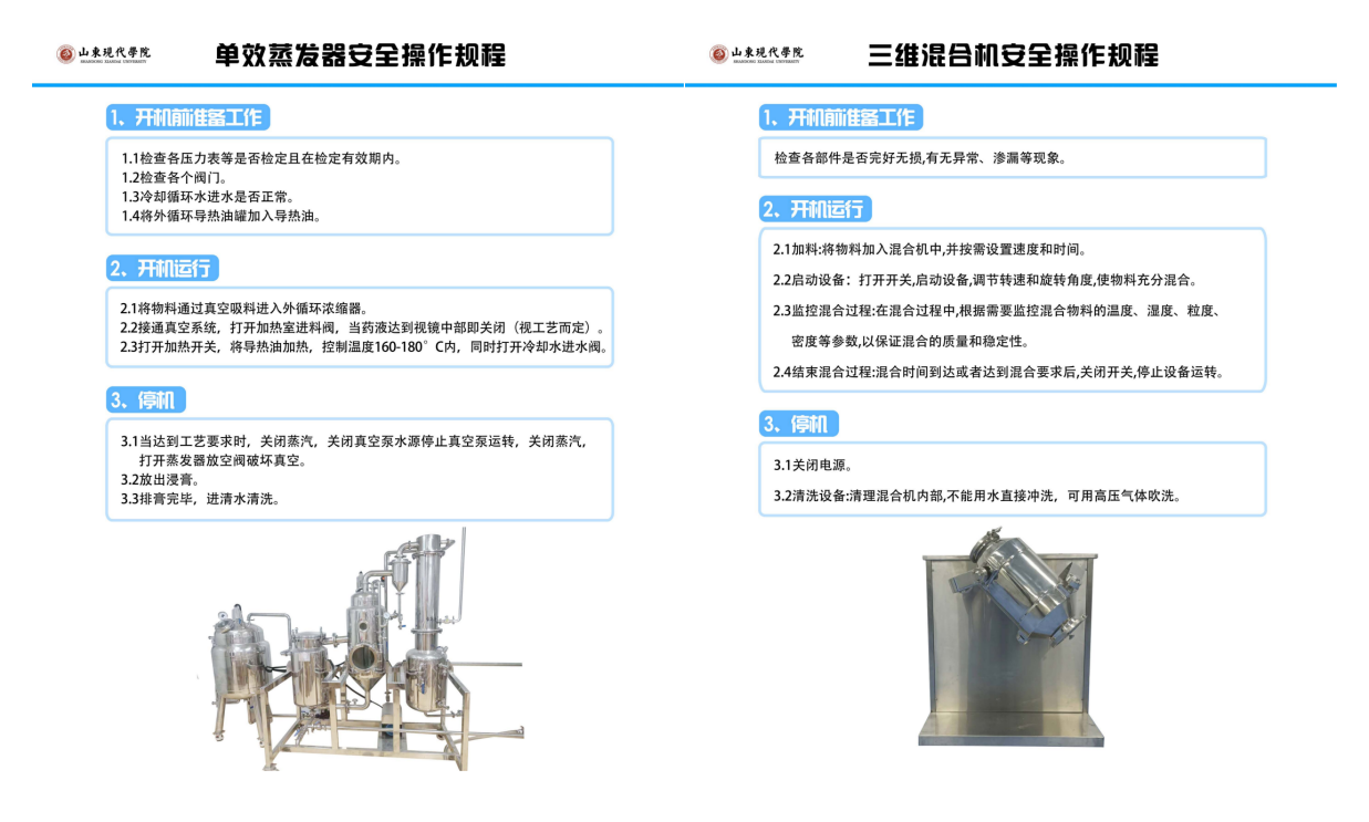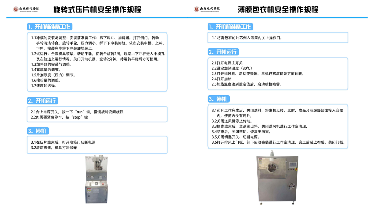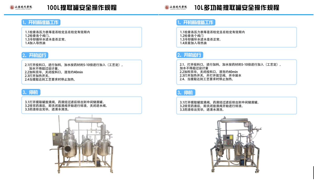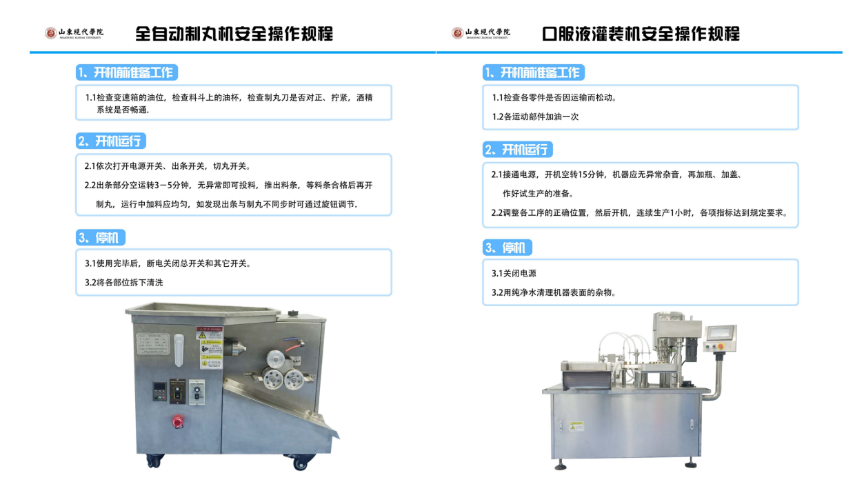 中药制药(仿GMP)实验实训车间按照《药品生产质量管理规范》(GMP)的标准建设而成,实验实训车间可以满足药学、中药学、中药制药等本专科专业学生在中药制剂方面的技能训练,保证学生完成制药厂特别是中药厂基本生产流程操作和质检工作的培训,可以作为新药研发的中试生产,可以生产医院制剂,也可以作为药品生产企业职工培训的平台。
